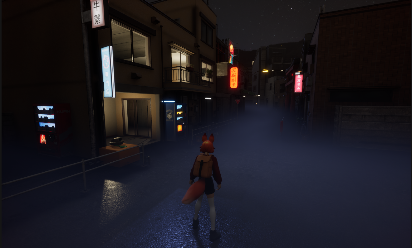 - Explore the quiet streets of a foggy Japanese neighborhood